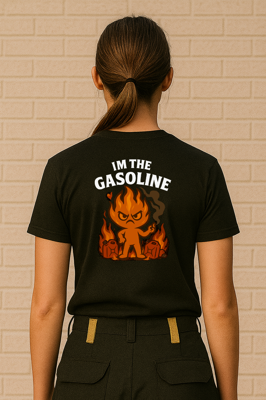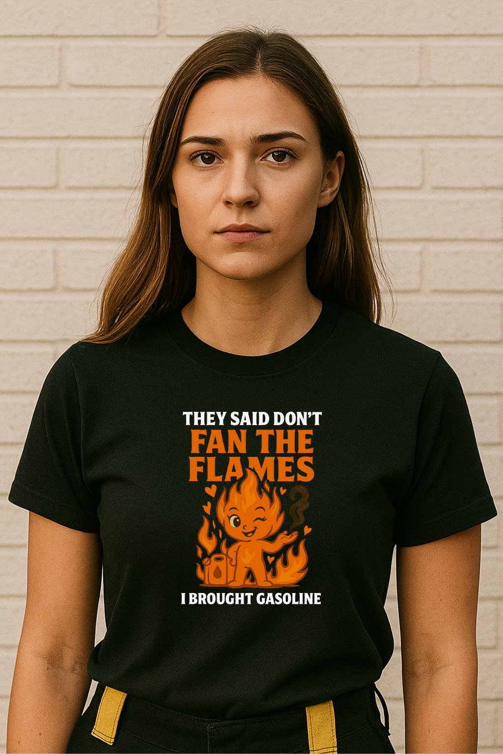 Es juguetona, orgullosa y apasionada. Las llamas se arremolinan en suaves curvas a su alrededor. Texto: "DIJERON QUE NO AVIVARAS LAS LLAMAS" "TRAÍ GASOLINA"