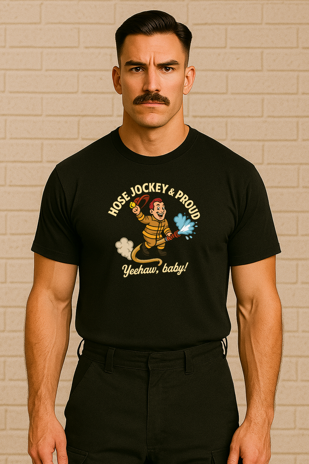 FRONTAL: El bombero de dibujos animados DECKIE monta una manguera cargada como un toro de rodeo. Texto superior : «MONTADOR DE MANGUERA Y ORGULLOSO». Texto inferior: « ¡Yeehaw, nena!».
