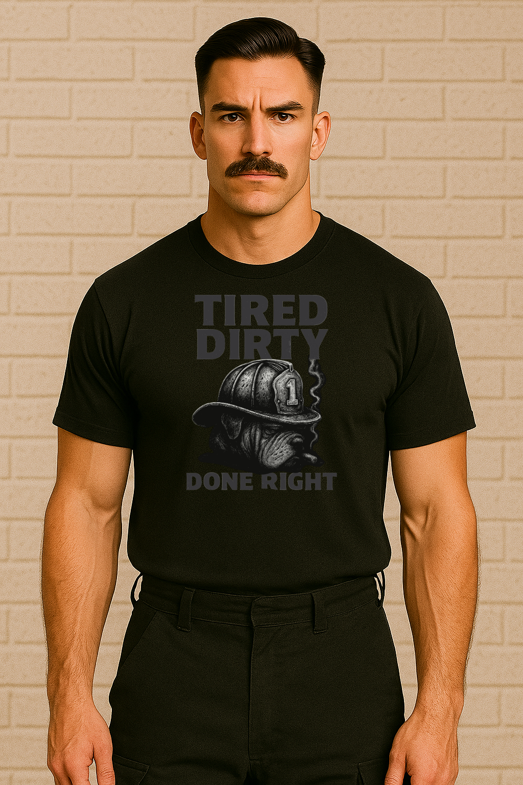FRONTAL: Arriba: « CANSADO Y SUCIO». Centro: Mascota Old Dawg con casco n.° 1, brasa de cigarro apenas encendida, cabeza gacha por el cansancio pero con una postura orgullosa. Abajo: « BIEN HECHO».