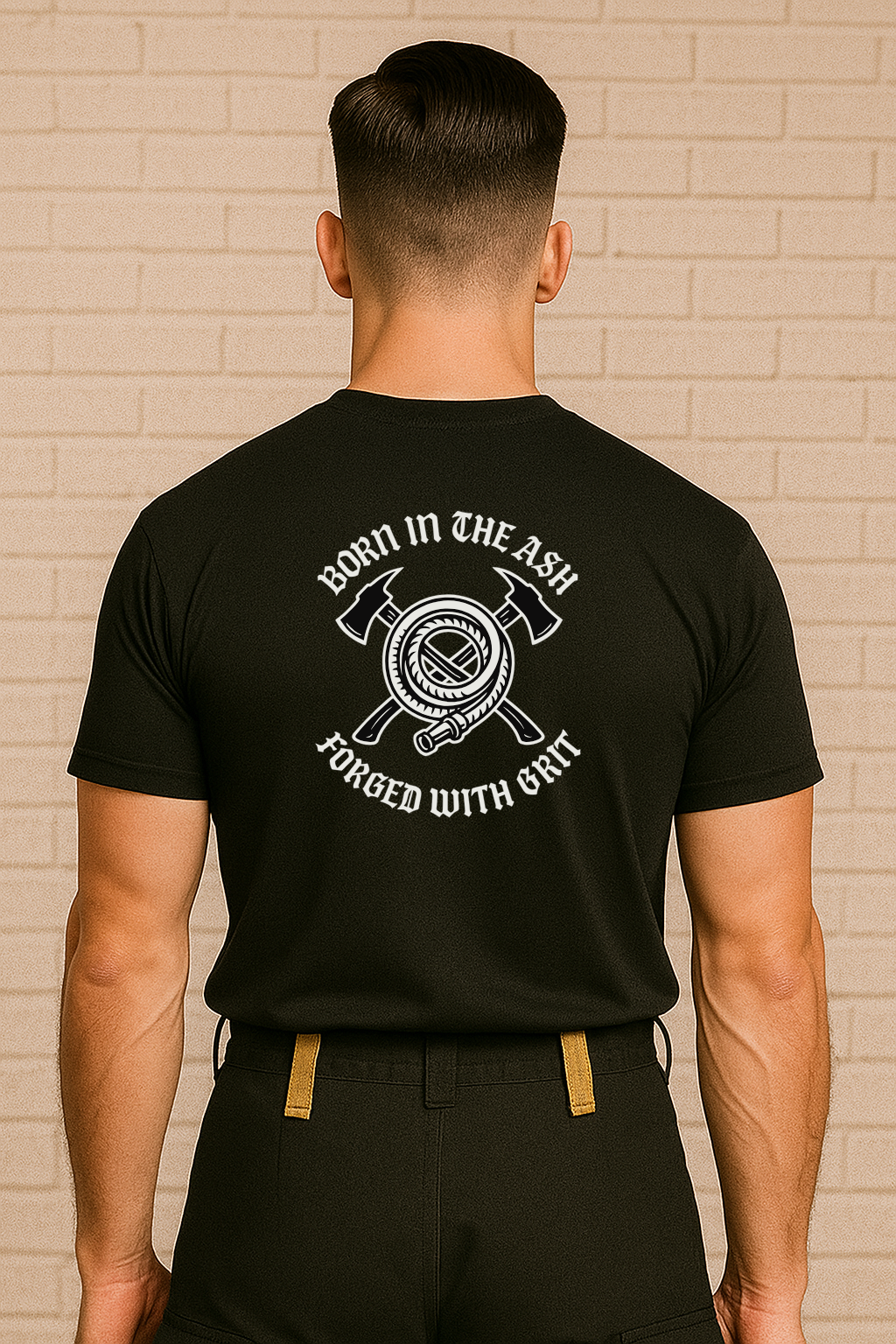 DOS: Un tuyau d'incendie enroulé forme un anneau avec des axes croisés ; l'arche supérieure porte l' inscription « Born in the Ash », l'arche inférieure « Forged with Grit », les deux en police TailboardDNA Blackletter. Style de tatouage minimaliste.