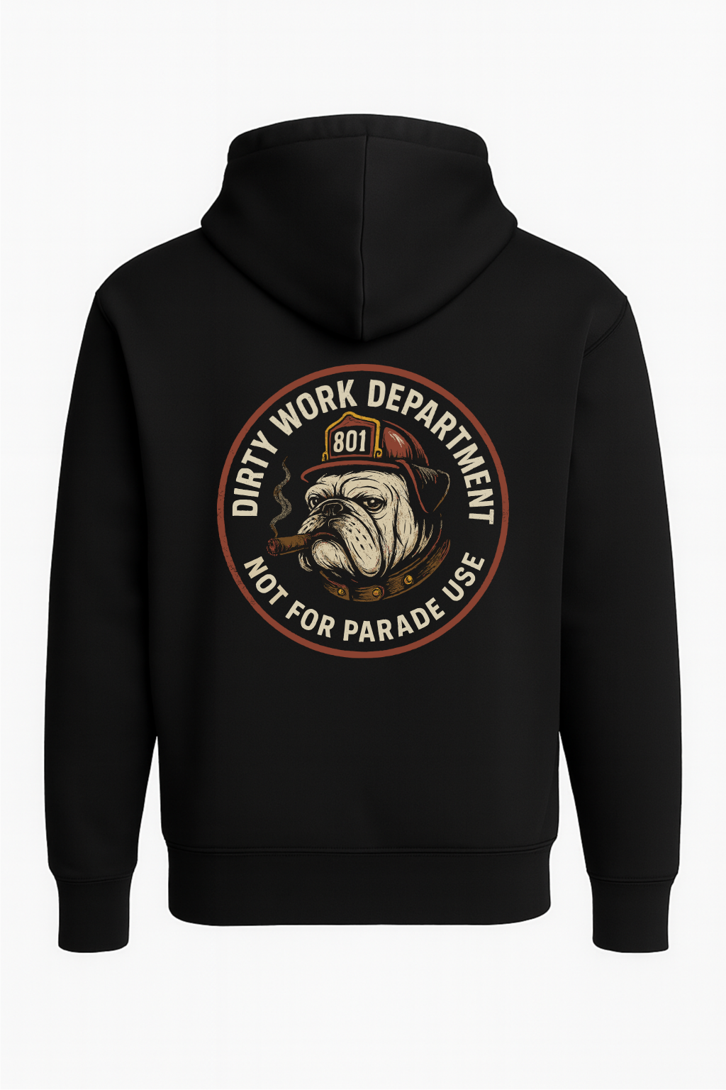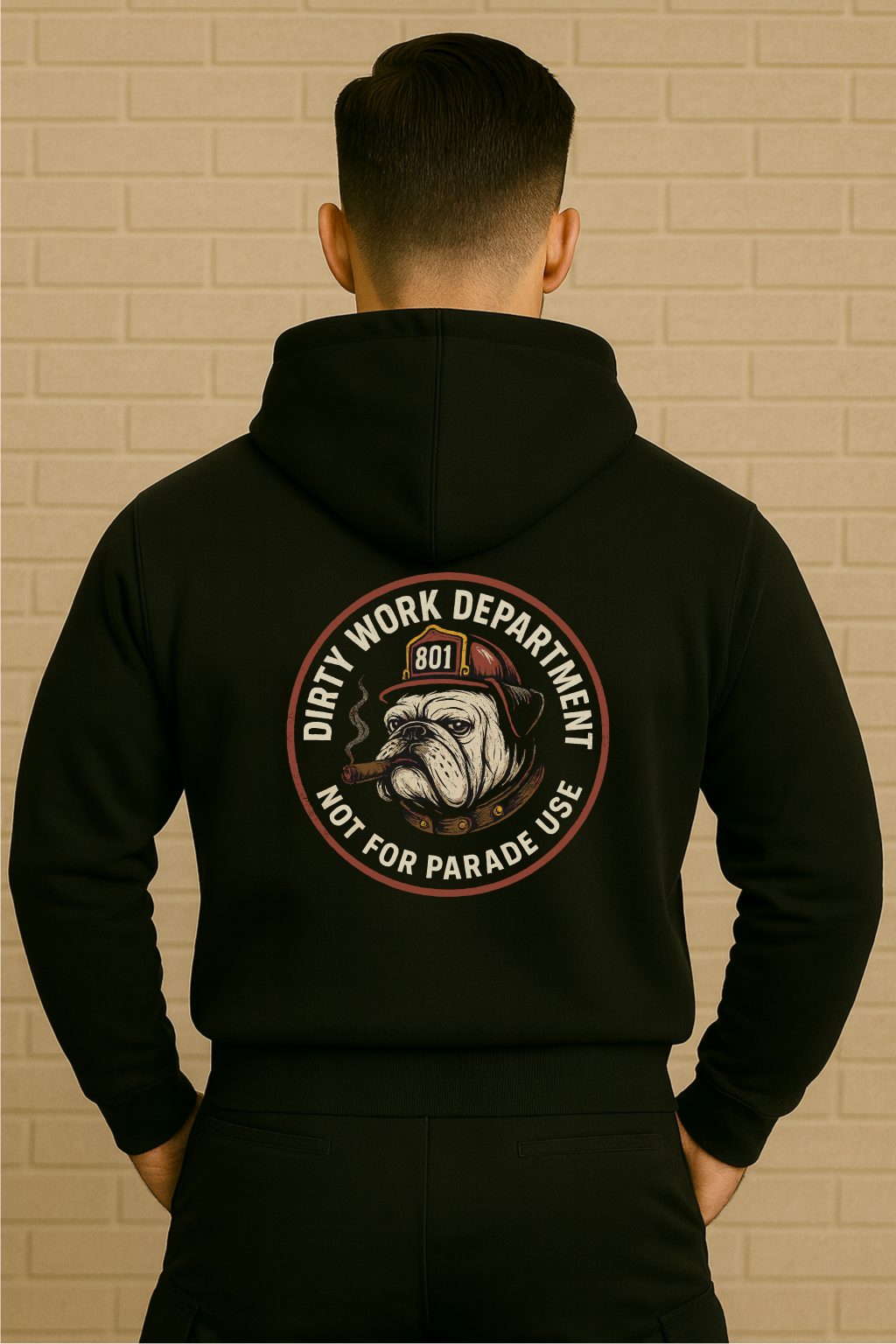 BACK: Circular patch design Old Dawg centred Top Arc Text: 'DIRTY WORK DEPARTMENT';  'NOT FOR PARADE USE'