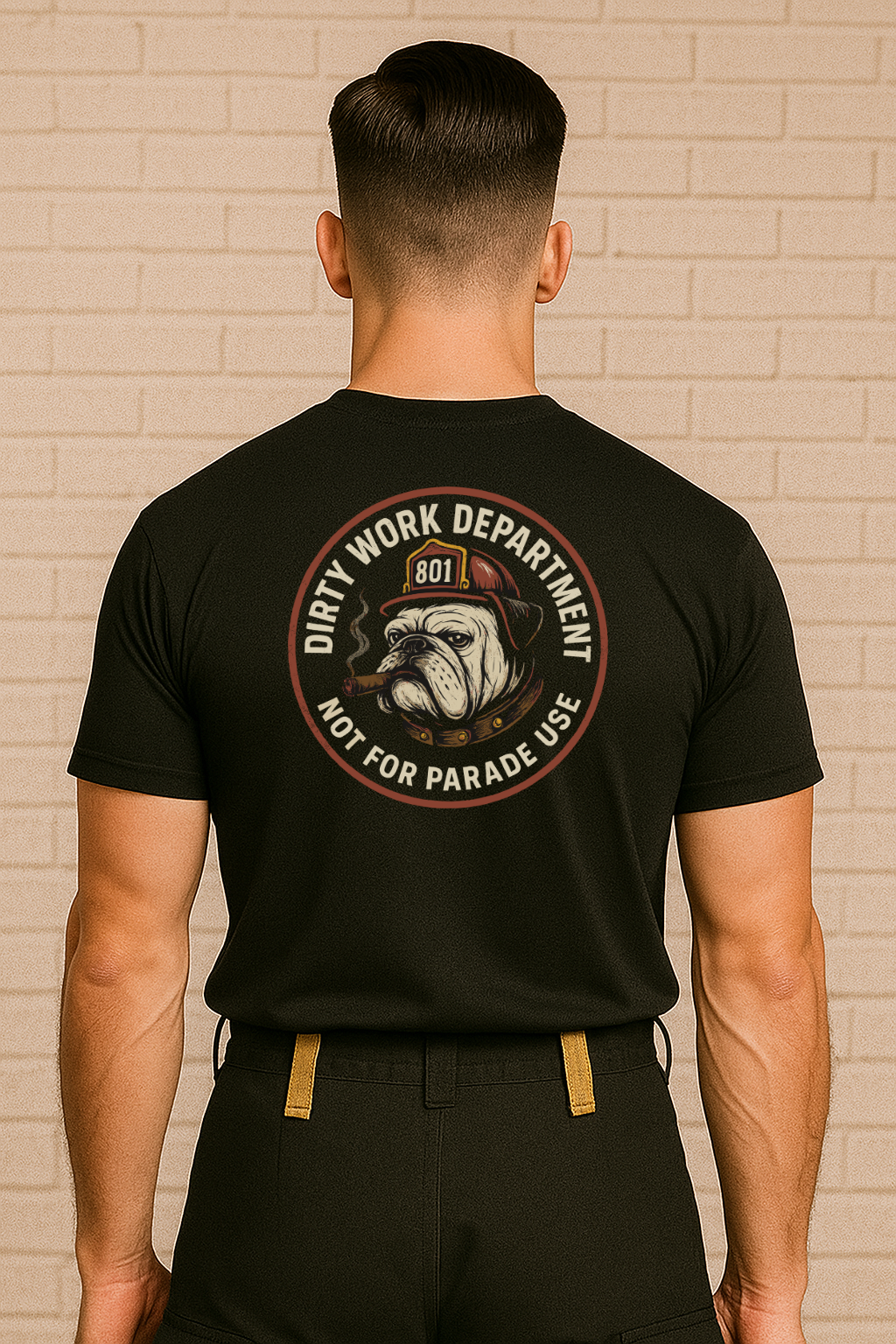 DOS: Écusson circulaire Old Dawg centré en haut, texte en arc de cercle : « DIRTY WORK DEPARTMENT » ; « NOT FOR PARADE USE »