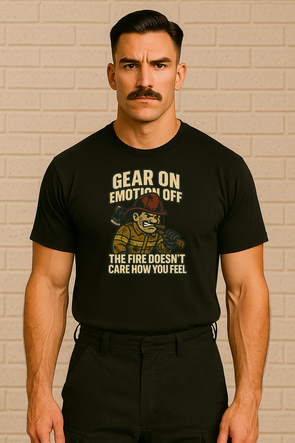 DEVANT : Princesse Pete se tient droit et confiant, hache sur l'épaule, braise de cigare incandescente. Texte : « ÉQUIPEMENT ACTIVÉ, ÉMOTION DÉSACTIVÉE » « LE FEU SE FICHE DE CE QUE VOUS RESSENTEZ »