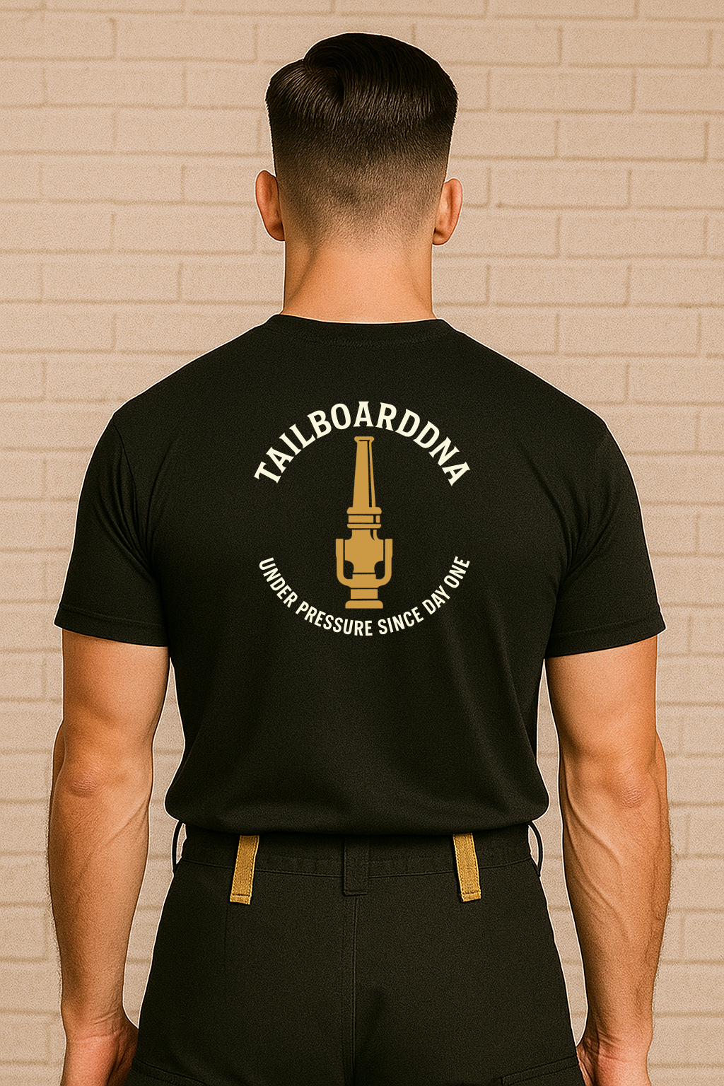 AU DOS : Buse verticale en laiton centrée, inscription « TAILBOARDDNA » en arc de cercle au-dessus, « UNDER PRESSURE SINCE DAY ONE » en arc de cercle en dessous