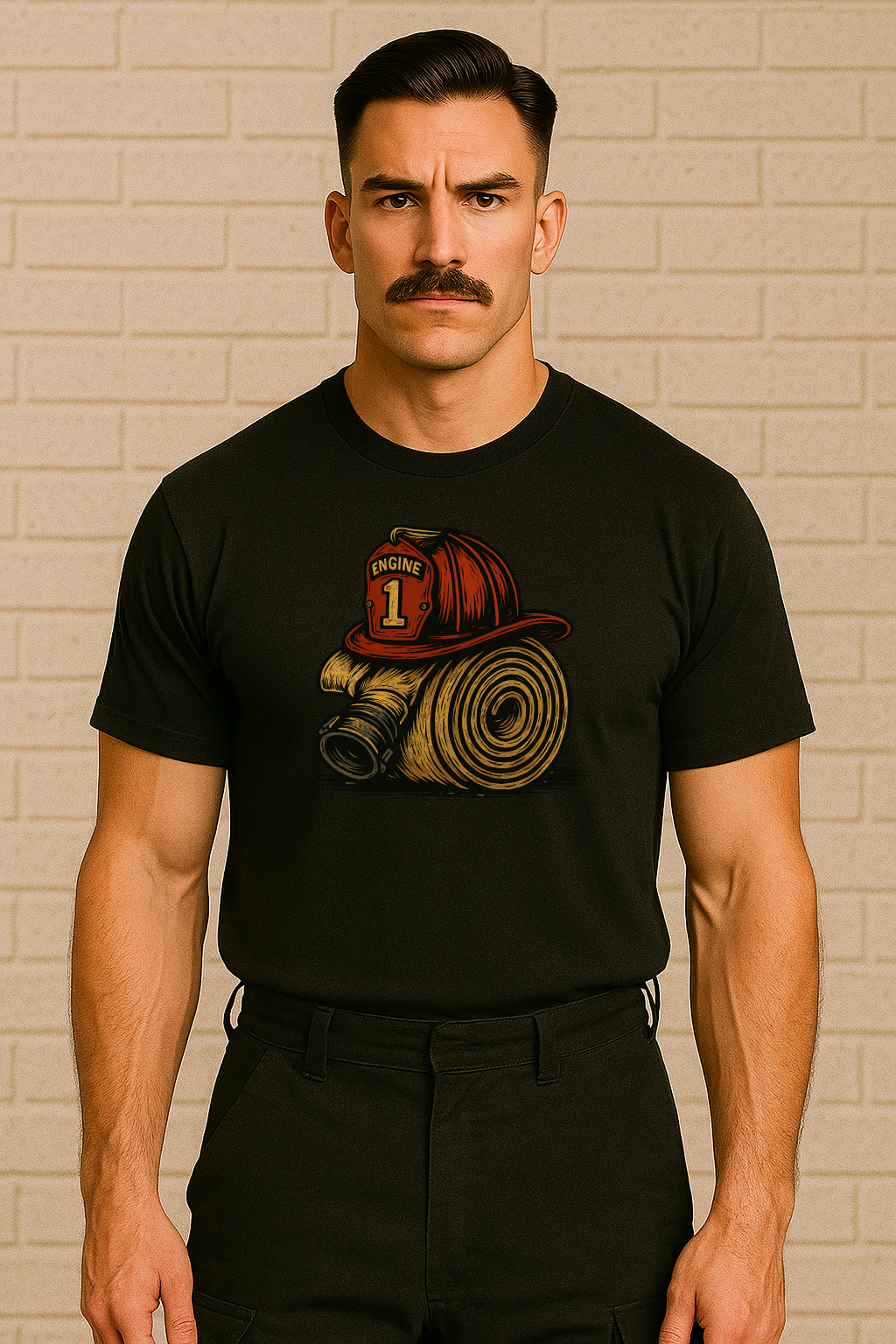 DEVANT: Tuyau enroulé soigneusement, surmonté d'un casque de pompier classique en cuir, dont l'écusson est gravé « ENGINE 1 ».