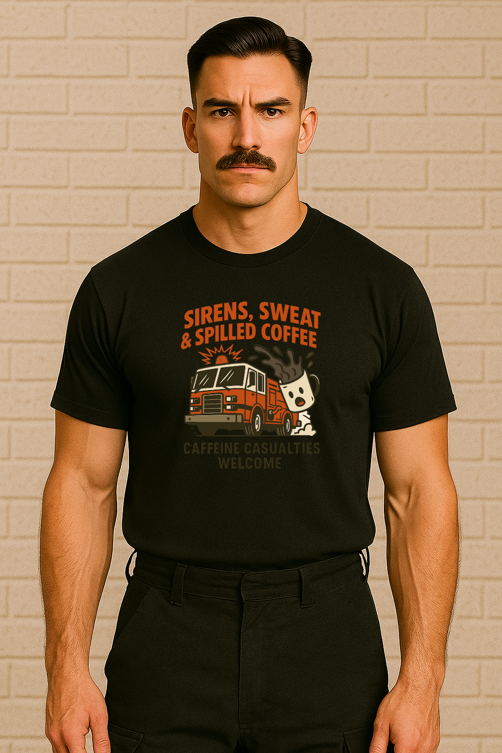 Un camion de pompiers lancé à toute vitesse soulève fumée et chaos lorsqu'une tasse à café aux allures de dessin animé est éjectée de la cabine – en plein vol, paniquée, et son café se répand en une vague. La phrase « SIRÈNES, SUEUR ET CAFÉ VAPORÉ » est inscrite en lettres capitales vieillies et en gras. En dessous, on peut lire : « BIENVENUE AUX VICTIMES DE LA CAFÉINE ».