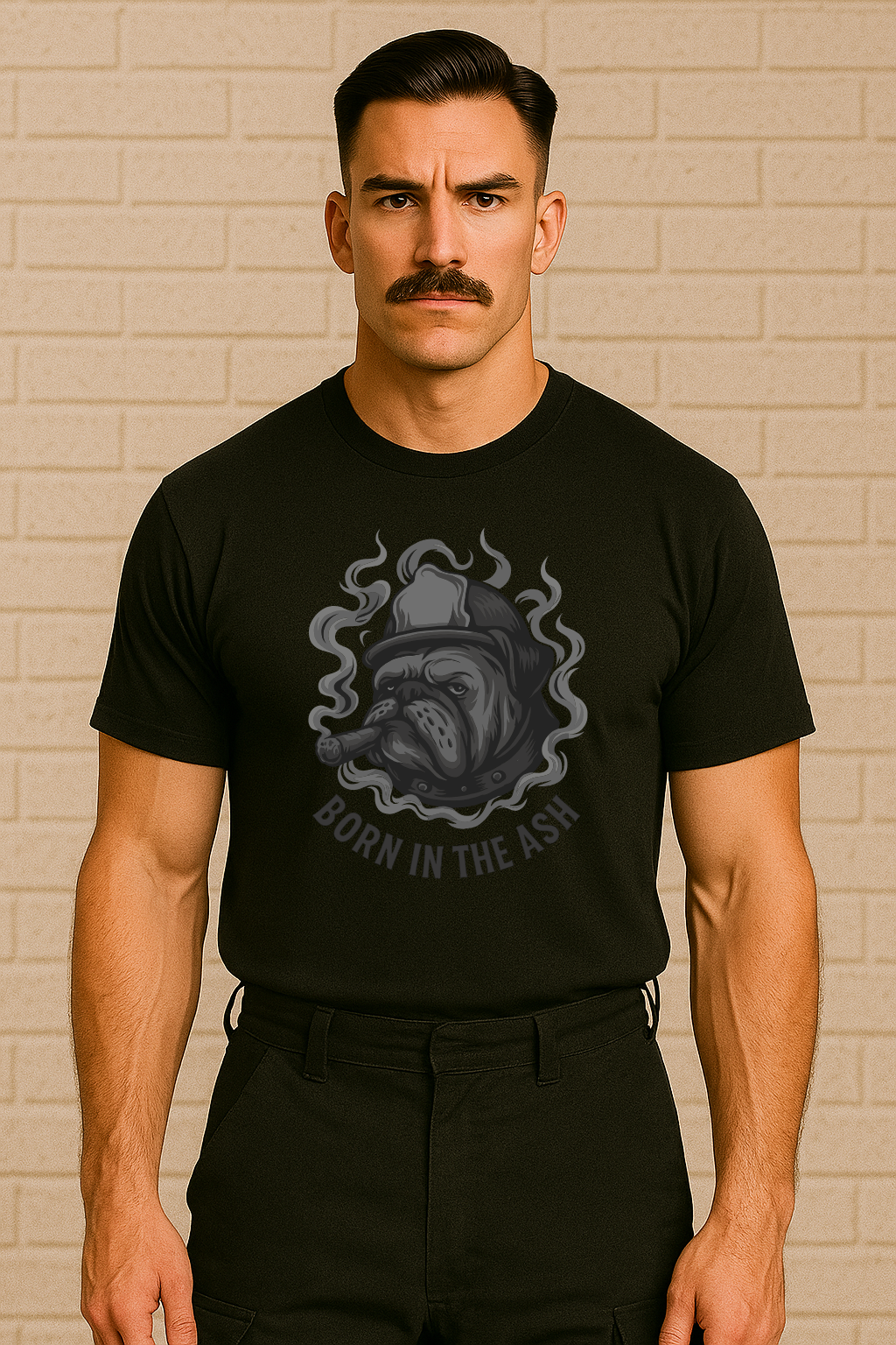 DEVANT: Un bouledogue gris entouré de volutes de fumée. Le texte « Né dans les cendres » apparaît en filigrane dans la brume.