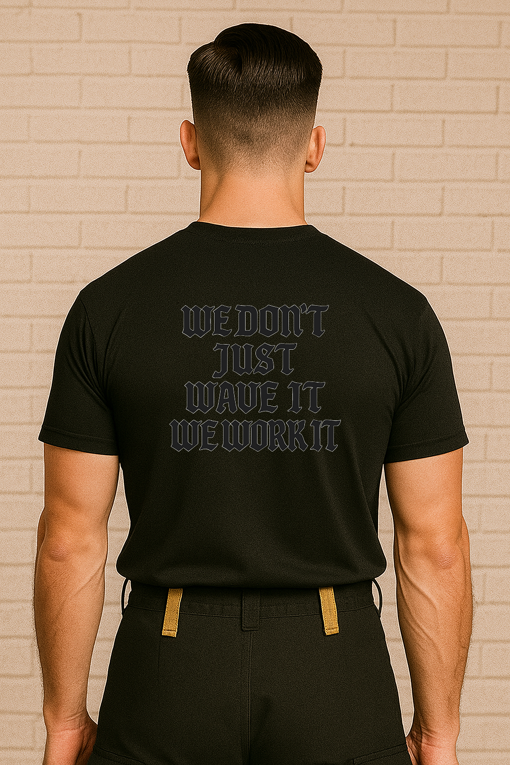 Back: Text 'WE DON'T JUST WAVE IT  WE WORK IT'