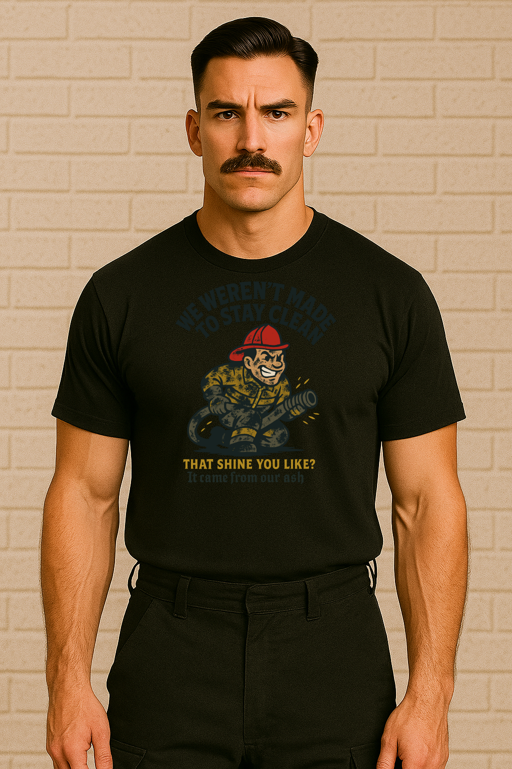 FRONT: Top ' We Weren’t Made to Stay Clean' Princess Pete crouched, dragging heavy firehose through ash Bottom: 'That shine you like? It came from our ash'