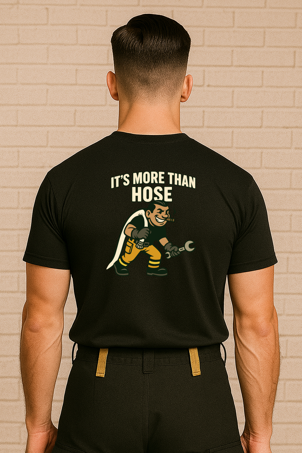 BACK:Princess Pete turnout pants half-buckled. Hose slung naturally over left shoulder full of slack, showing the literal and symbolic weight of the line. Wrench in his other hand.Text:'IT'S MORE THAN HOSE'